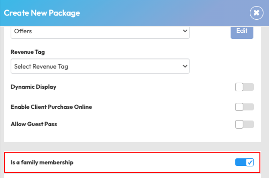 Switch the 'Is a family membership' or 'Is a family package' toggle to ON