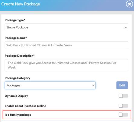 Important note: Once a Family Membership is created, it can’t be changed back to a standard membership. The family toggle cannot be turned off, and features like Shared Credits and Guest Passes are disabled, as the family membership already acts as a shared credit for a defined group. Once a package is created without family membership toggled, it cannot be converted to a family membership later.