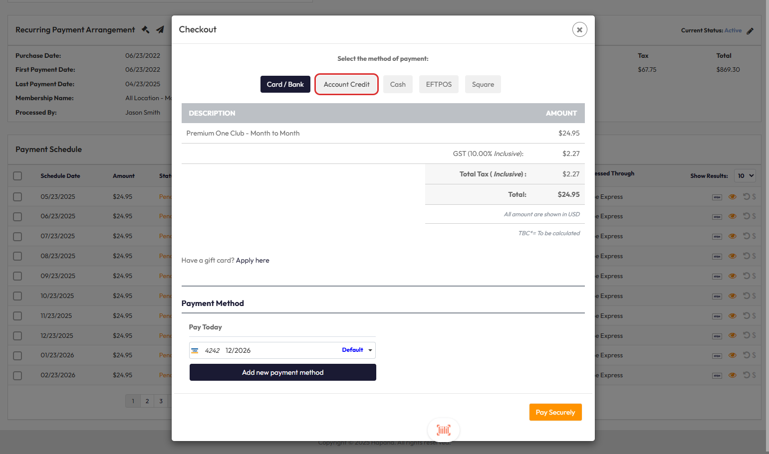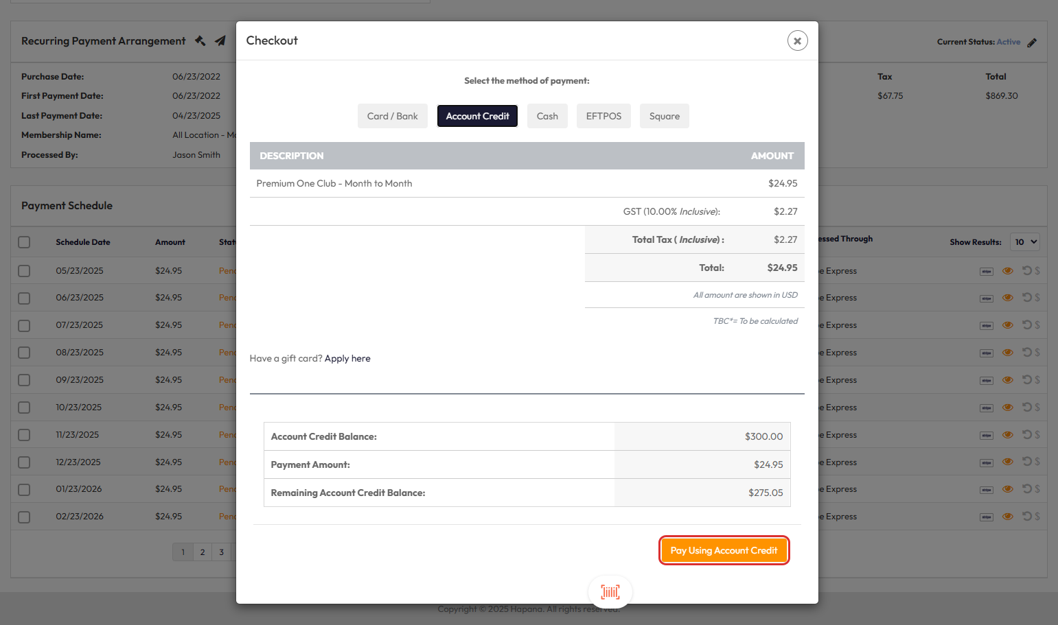 Managing client payments is easy with Hapana's account credit feature. This article covers how to apply a client's available account credit toward their recurring membership payments, helping you reduce manual work and streamline payment collection.