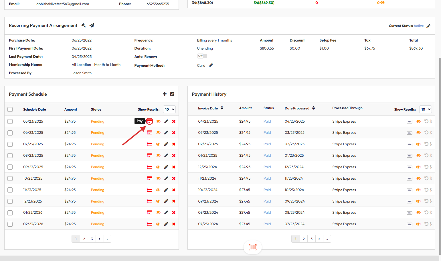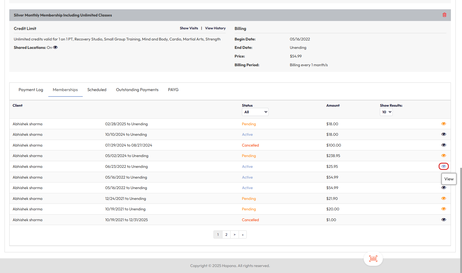 - Find the correct membership and click the eye icon to the right of the membership to View the details.