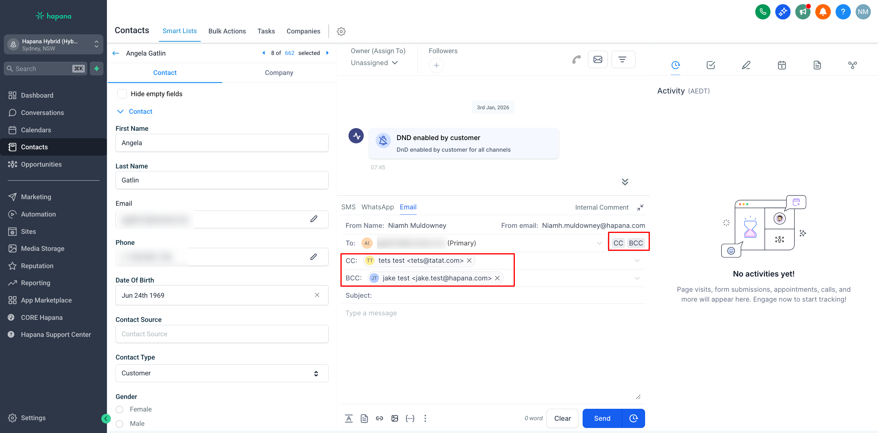 Your email will be sent with the added CC and/or BCC recipients included. CC’d contacts will see each other’s addresses, while BCC’d contacts remain hidden from all recipients.