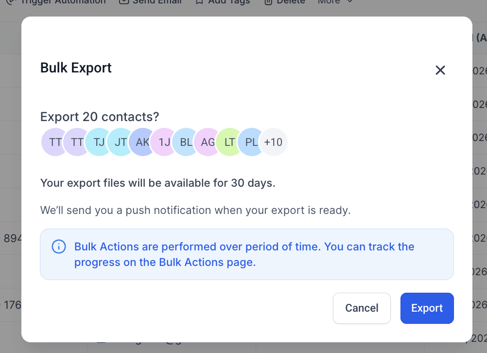 If you want to export all filtered contacts (not just the current page), a prompt will appear — click Select all [X] records.