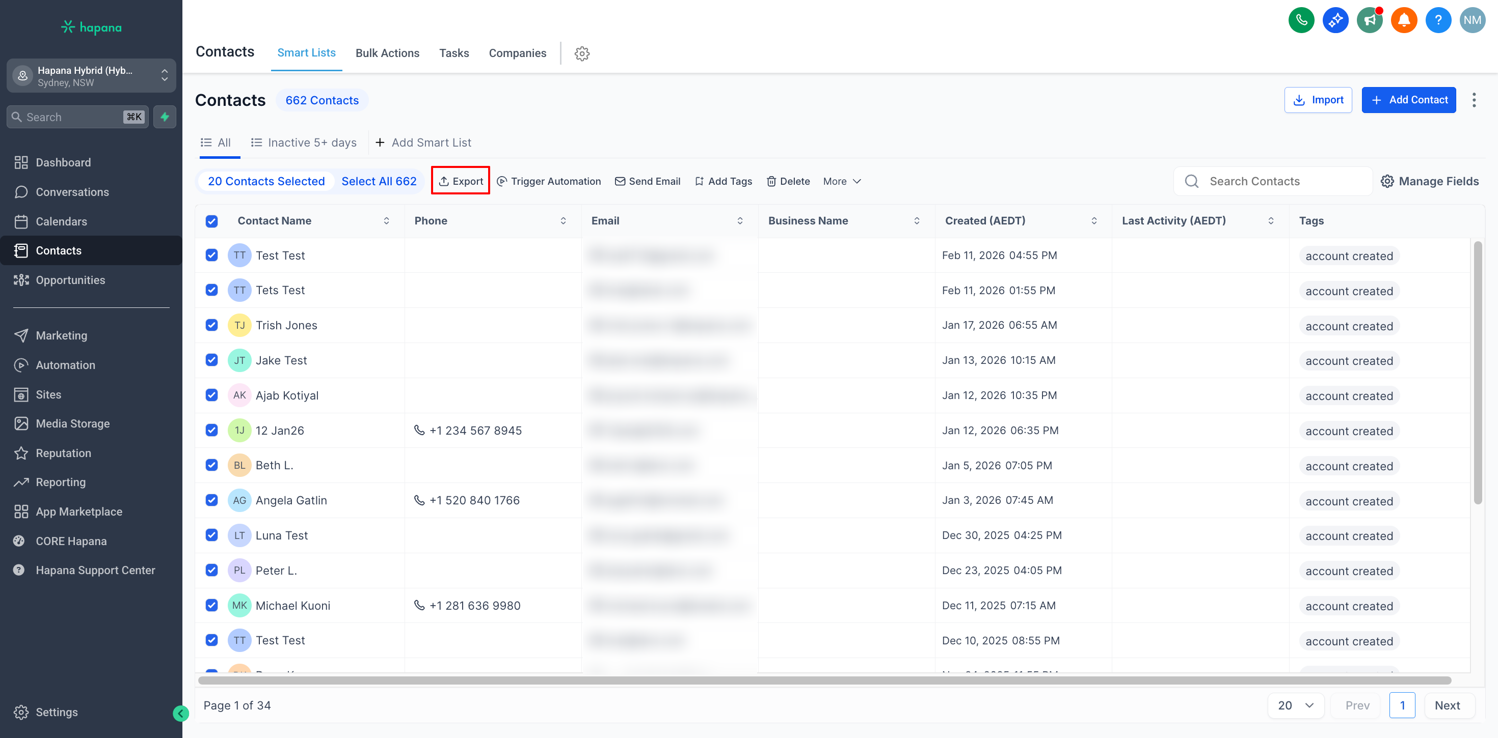 Tip: The exported file will include common fields like name, email, phone, tags. If you’d like to add more fields to the csv document, you must select those fields from the Columns dropdown.