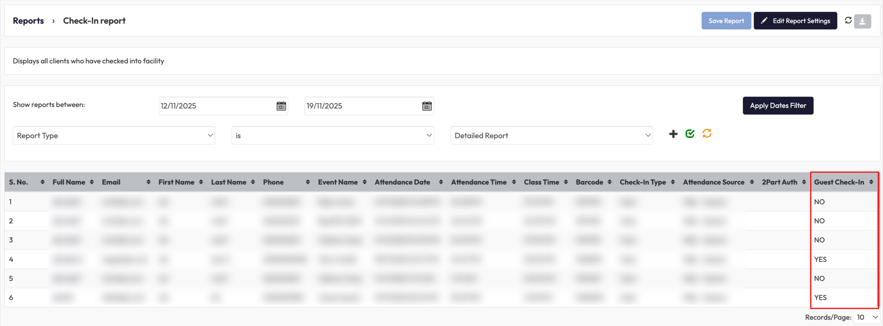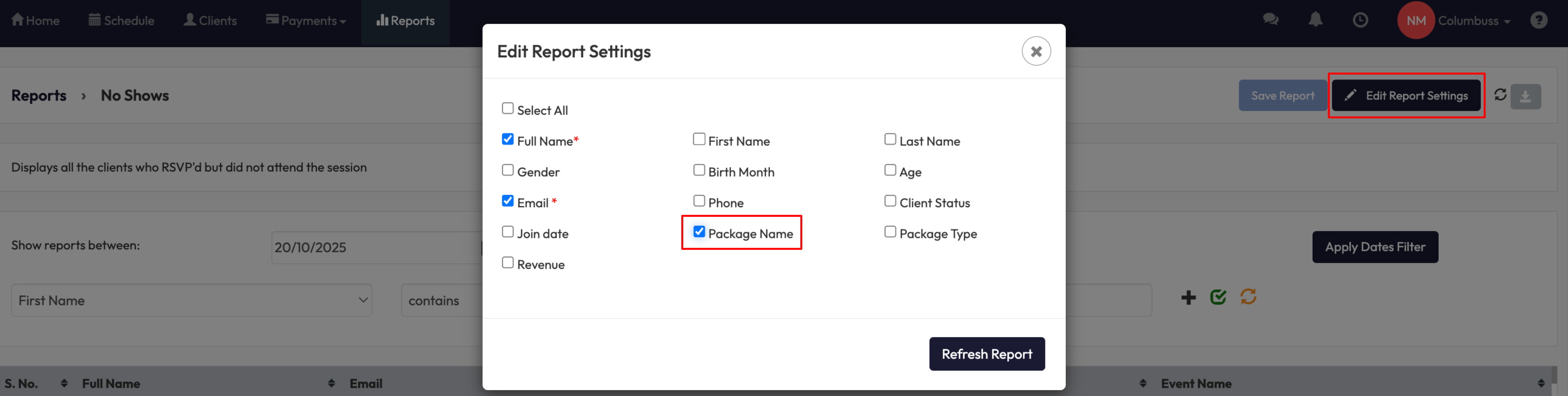 3. No Shows Report: When the Package Name column is visible, (Guest Pass) will be visible in the package name. The Package Name column can be added to this report via the Edit Report Settings section.