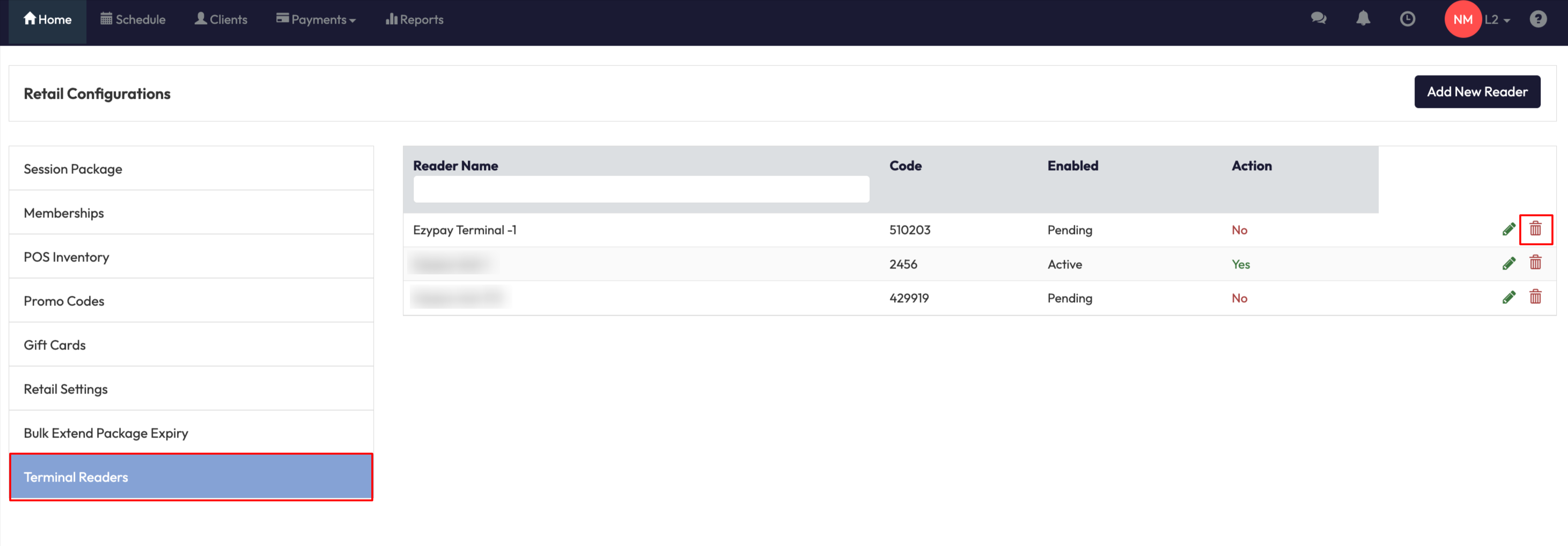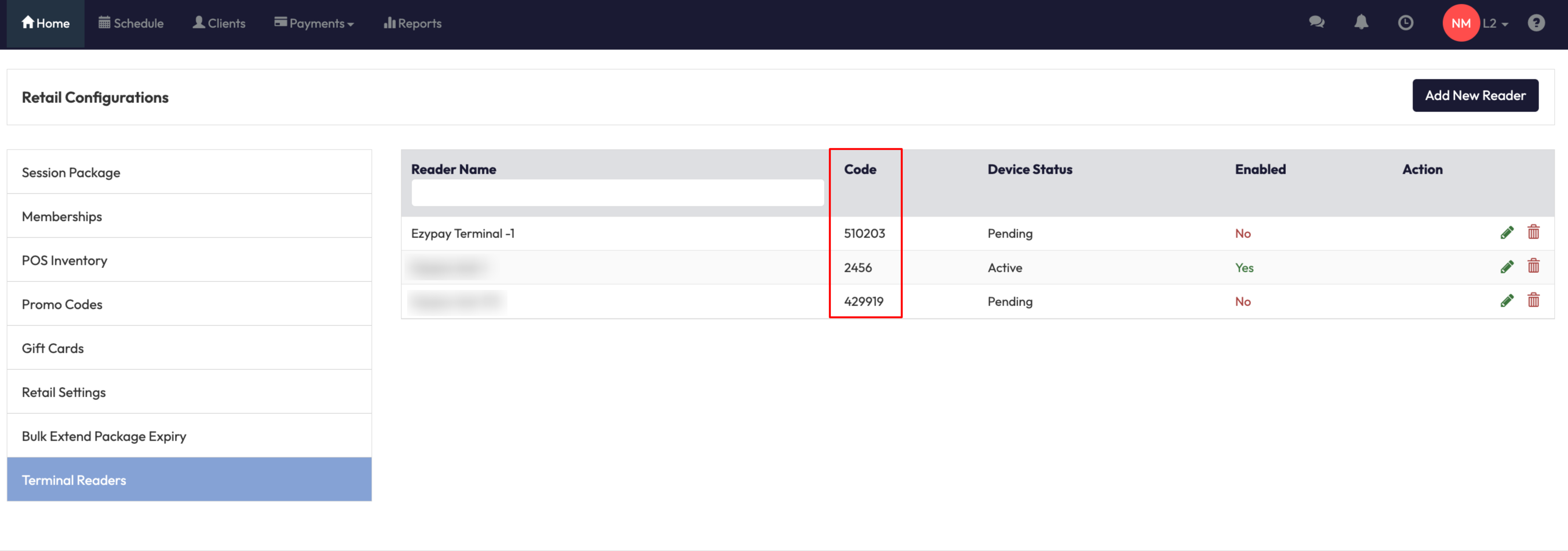 - The Activation Code will display in Payments > Retail Configurations > Terminal Readers > Code. Enter this Activation Code into the Ezypay Tap to Pay mobile app.