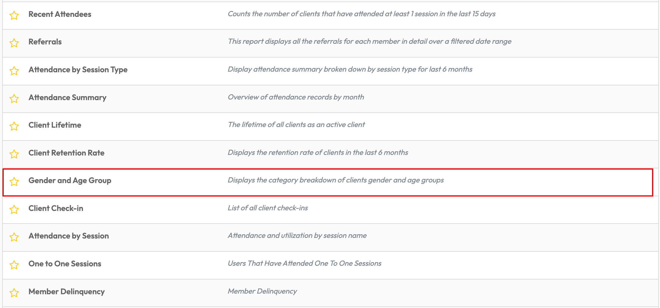 Within the Clients & Attendance Report Category, select Gender and Age Group Report