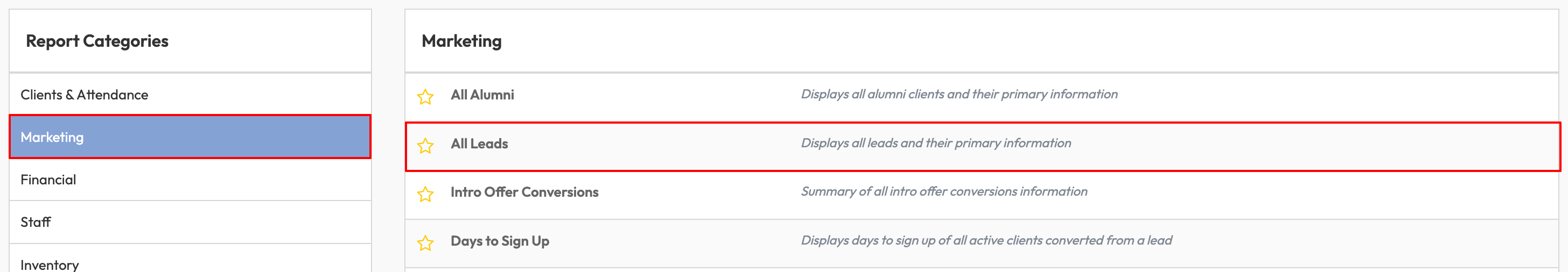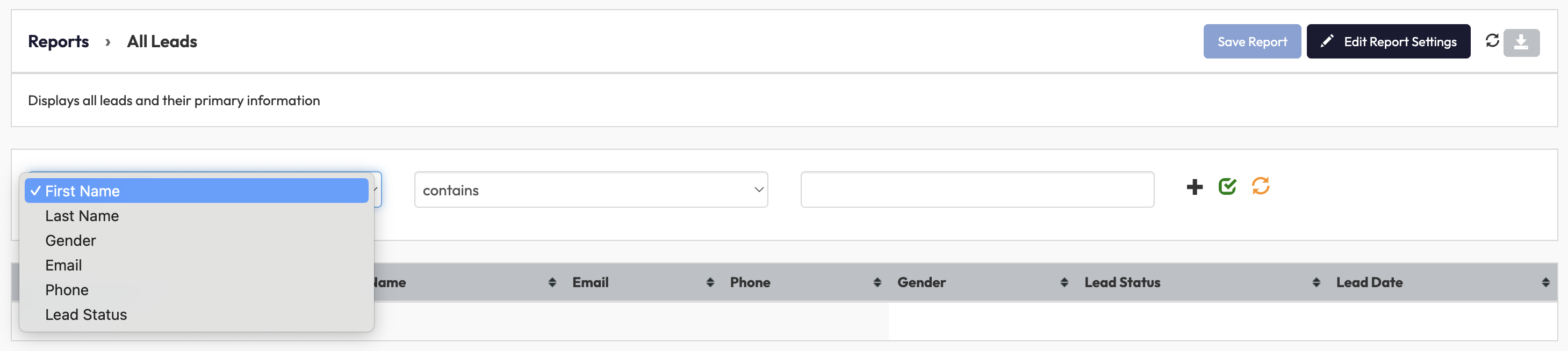The All Leads report includes key columns by default and lets you adjust what’s displayed.