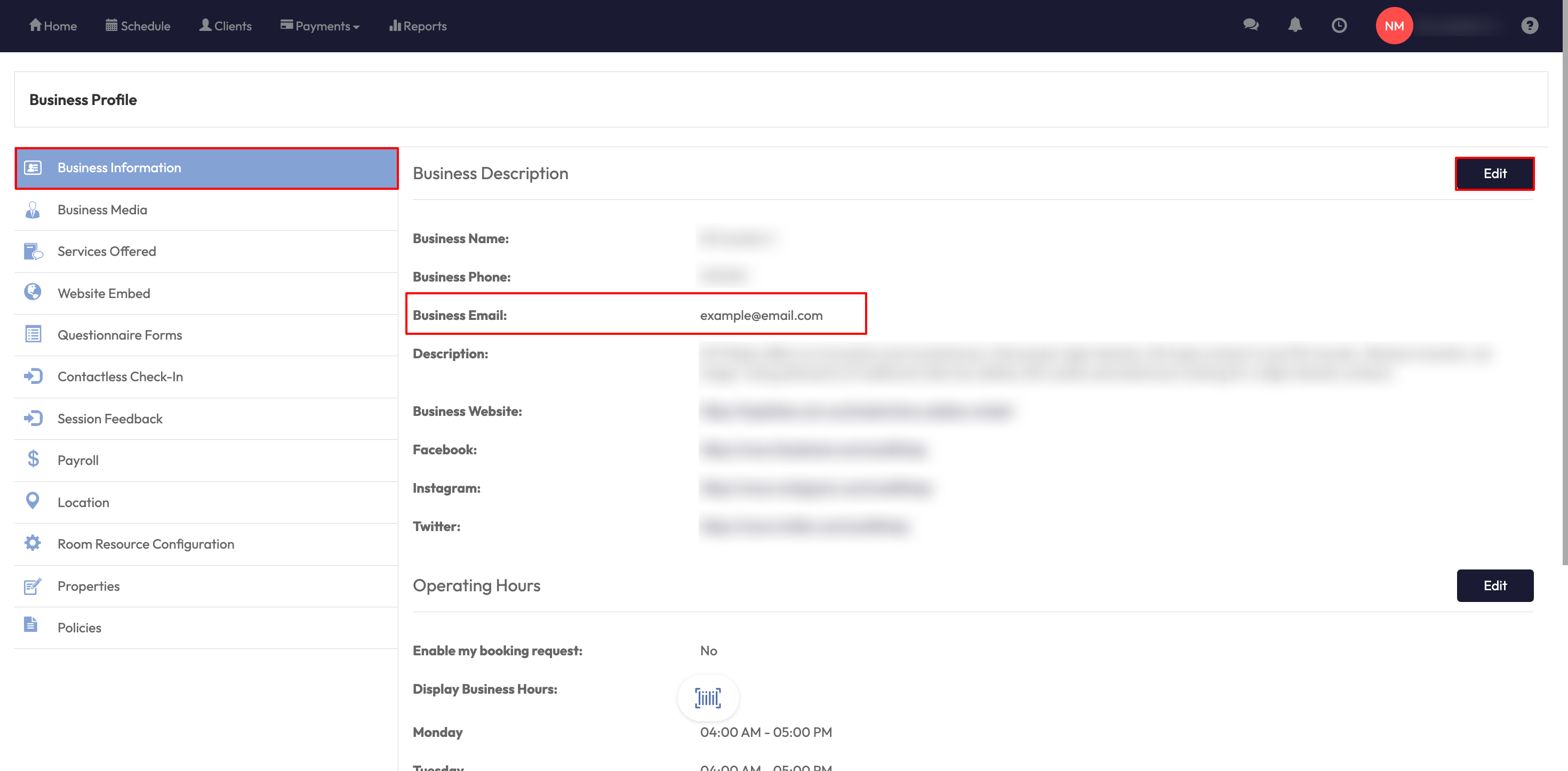 Locate the Business Email field within the Business Information section. Important note: This Business Email field will be populated by default with your Invoice email as set in Payments > Retail Configurations > Retail Settings > Client Invoice Settings.
